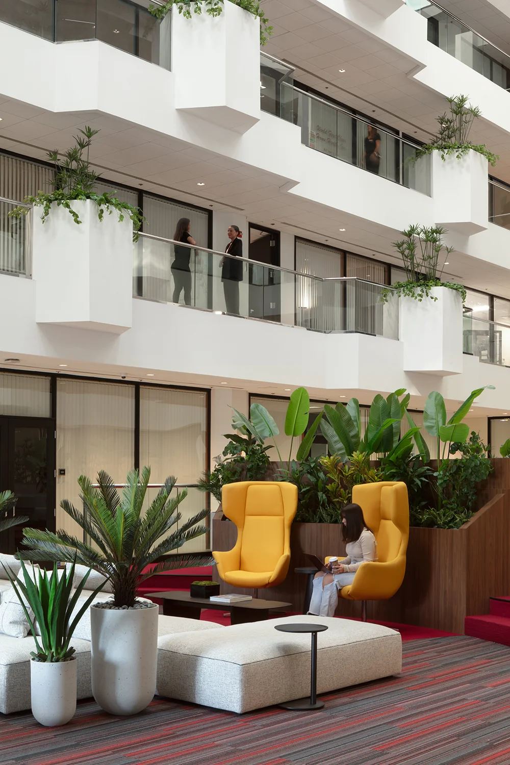 The result is a modern office building with thoughtful, flexible layouts and a cohesive, inviting design. The vibrant material selections, strategic seating arrangements, comfortable furniture, and natural elements add warmth, creating a welcoming environment that tenants will want to use.
